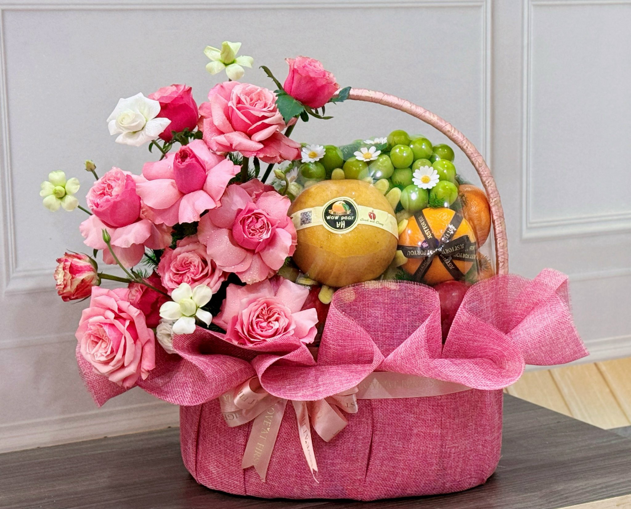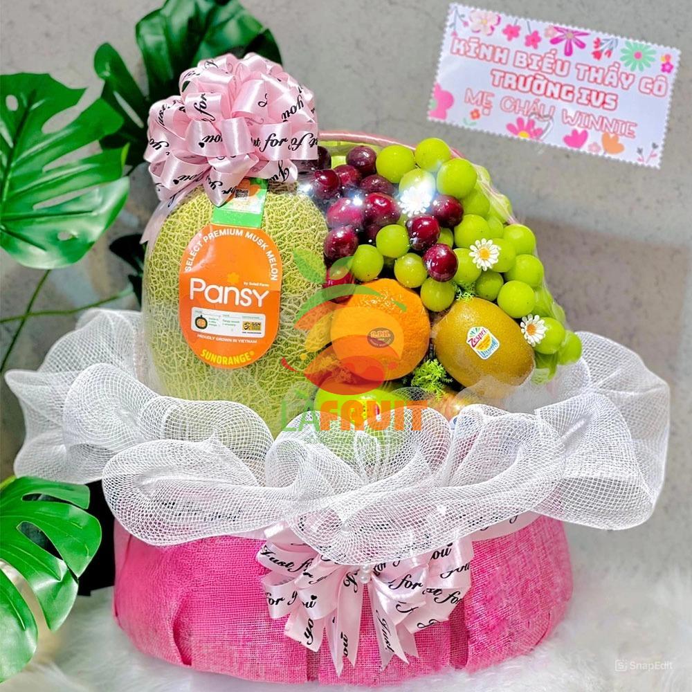 Giỏ trái cây gồm kiwi, nho mẫu đơn chùm, cam úc, táo envy, lê sữa hoặc lên nâu cùng hoa hồng tươi nhiều màu sắc hứa hẹn mang đến một món quà nhiều ý nghĩa.